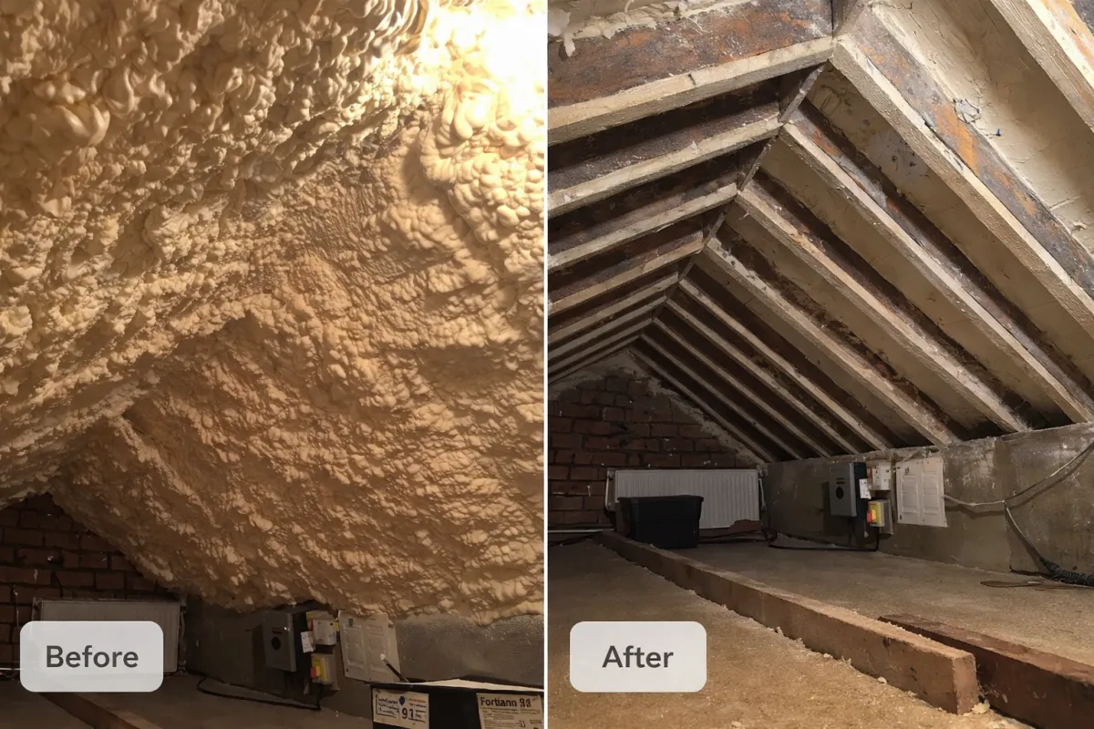 Instead, we safely remove the spray foam, restore proper roof airflow, protect the roof structure, and document every stage of the process so lenders and surveyors have exactly what they require.